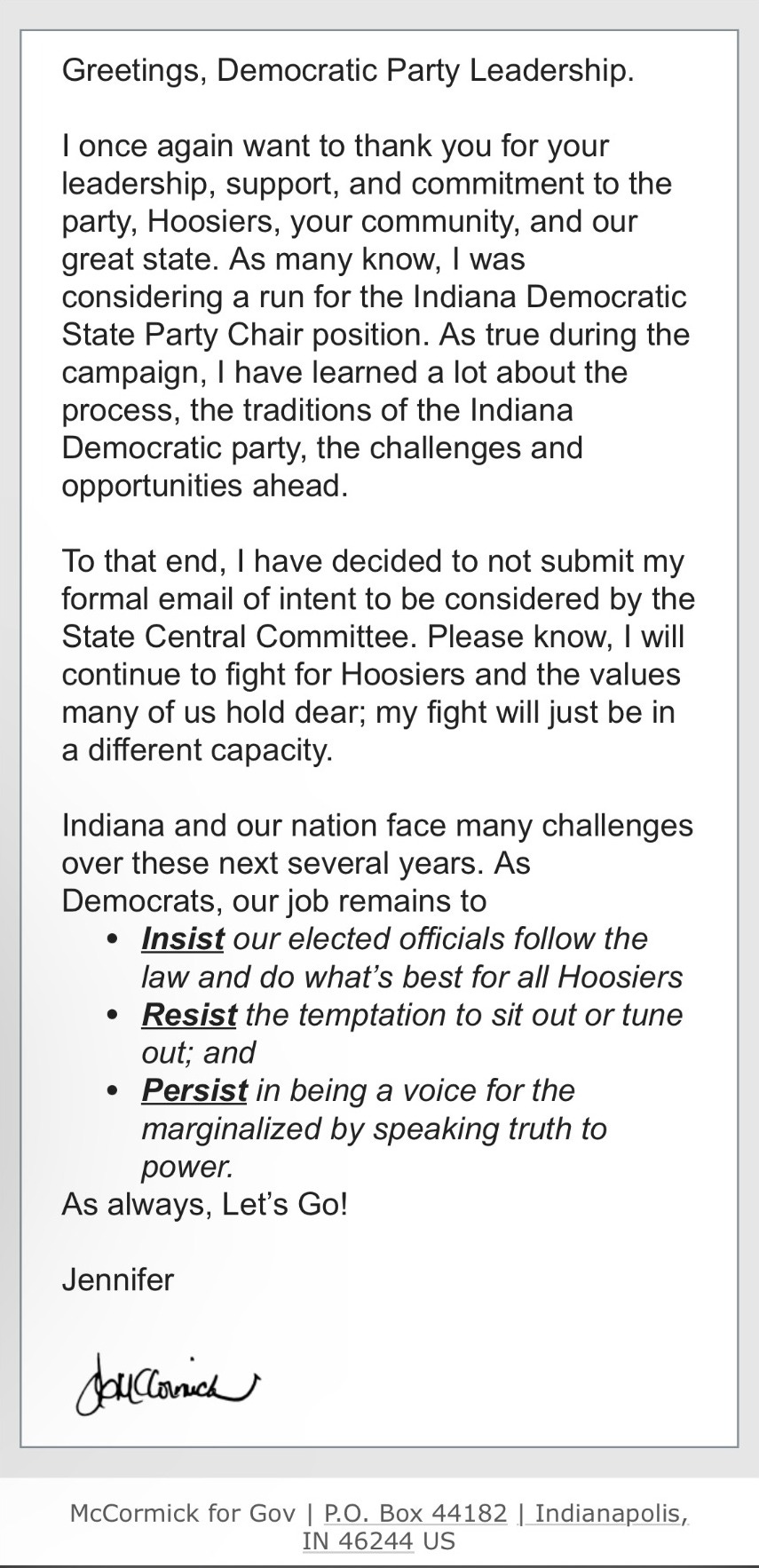 Jennifer McCormick will NOT seek Indiana Democratic Party Chair